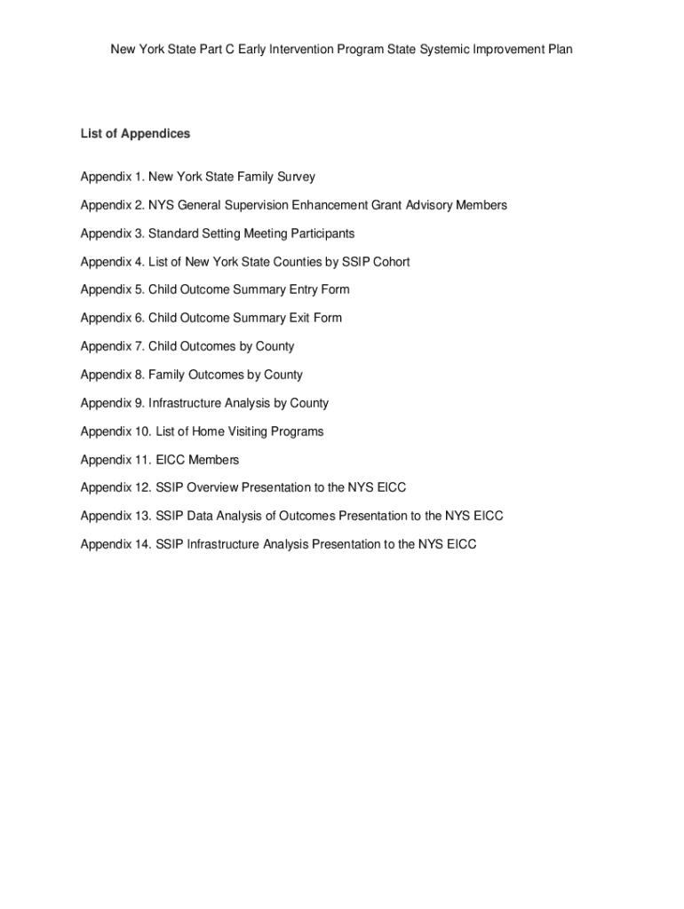 New York State Part C Early Intervention Program State Systemic Improvement Playlist of Appendices Appendix 1. New York State Family Survey Appendix 2. NYS General Supervision Enhancement Grant Advisory