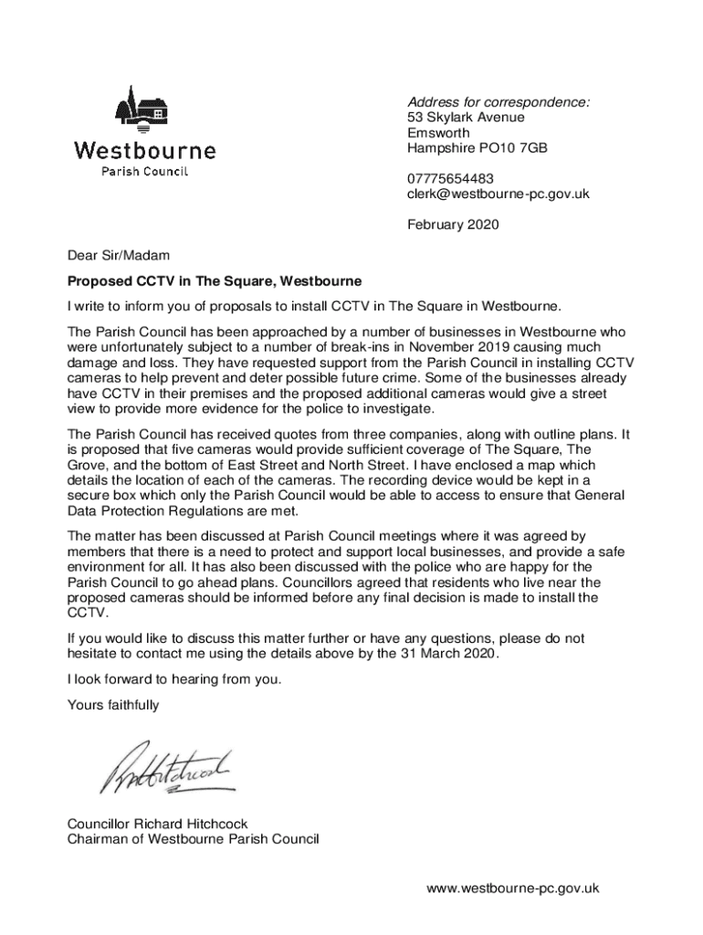 Address for correspondence: 53 Skylark Avenue Ems worth Hampshire PO10 7 GB 07775654483 clerk×westbournepc.gov.UK February 2020 Dear Sir×Madam Proposed CCTV in The Square, Westbound I write to