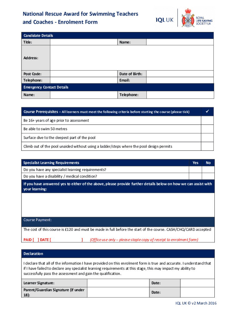 NationalRescueAwardforSwimmingTeachers andCoachesEnrolmentForm CandidateDetails Title:Name:Address: Postcode:DateofBirth:Telephone:Email:Telephone:EmergencyContactDetails Name: CoursePrerequisitesAlllearnersmustmeetthefollowingcriteriabeforestartingthecourse×please