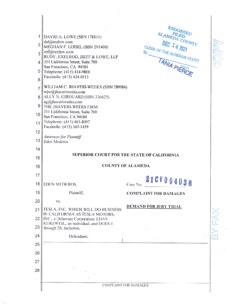 1Eden Meters complains and alleges as follows:2 3NATURE OF THE CASE 1. Although Tesla publicly claims that it fosters a safe and respectful environment4 for its workers,1 the truth is that for years