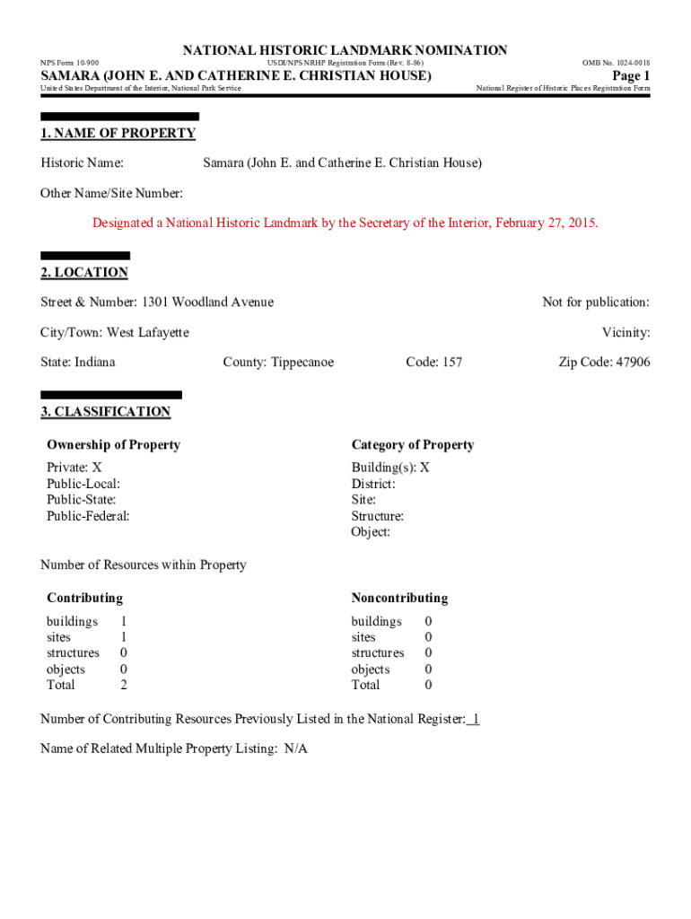 NATIONAL HISTORIC LANDMARK NOMINATION NPS Form 10900USDI×NPS CNRHP Registration Form (Rev. 886×SAMARA (JOHN E. AND CATHERINE E. CHRISTIAN HOUSE) United States Department of the Interior, National