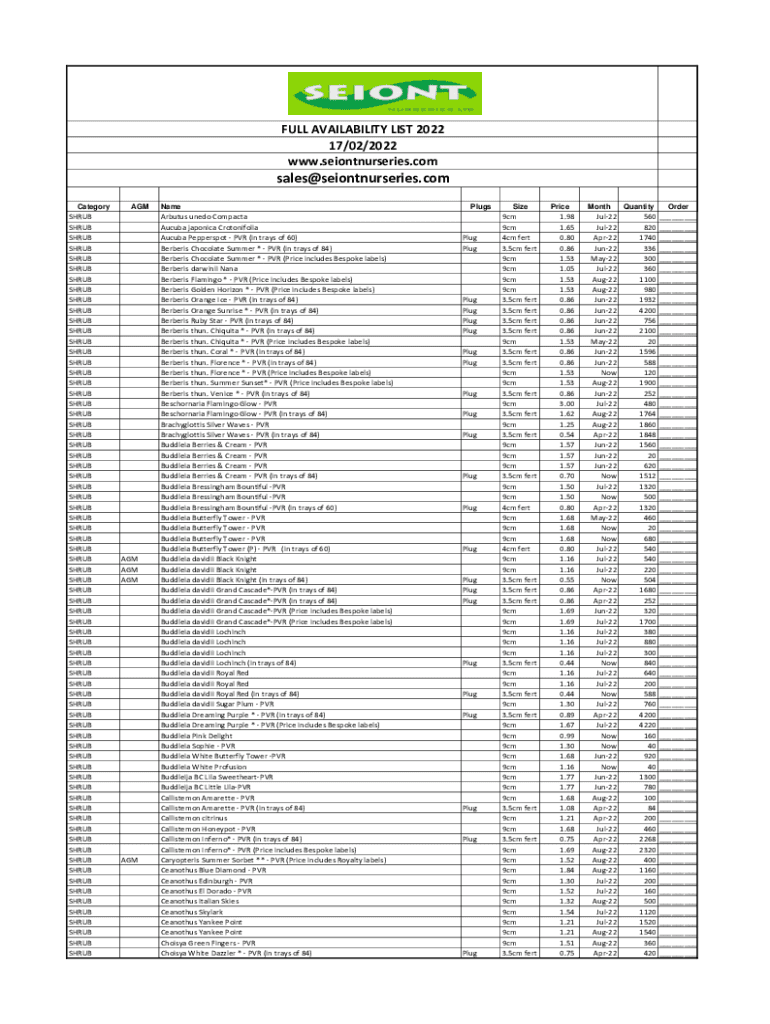 FULL AVAILABILITY LIST 2022 17×02/2022 www.seiontnurseries.comsales×seiontnurseries.com CategorySHRUB SHRUB SHRUBAGMAGM AGM
