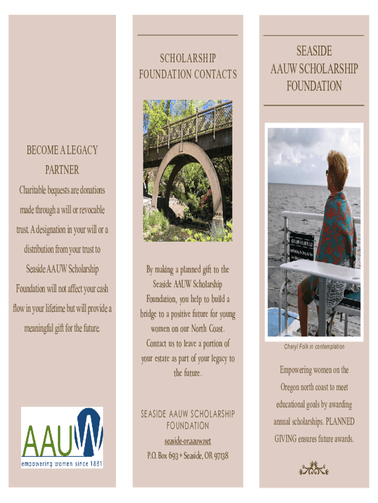 SCHOLARSHIP FOUNDATION CONTACTSSEASIDE AAU SCHOLARSHIP FOUNDATIONBECOME A LEGACY PARTNER Charitable bequests are donations made through a will or revocable trust. A designation in your will or a distribution