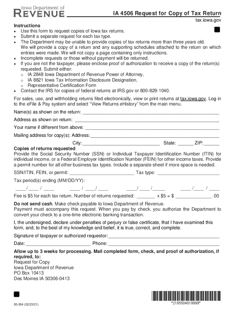 IA 4506 Request for Copy of Tax Return tax.Iowa.gov Instructions Use this form to request copies of Iowa tax returns. Submit a separate request for each tax type. The Department may be unable to provide