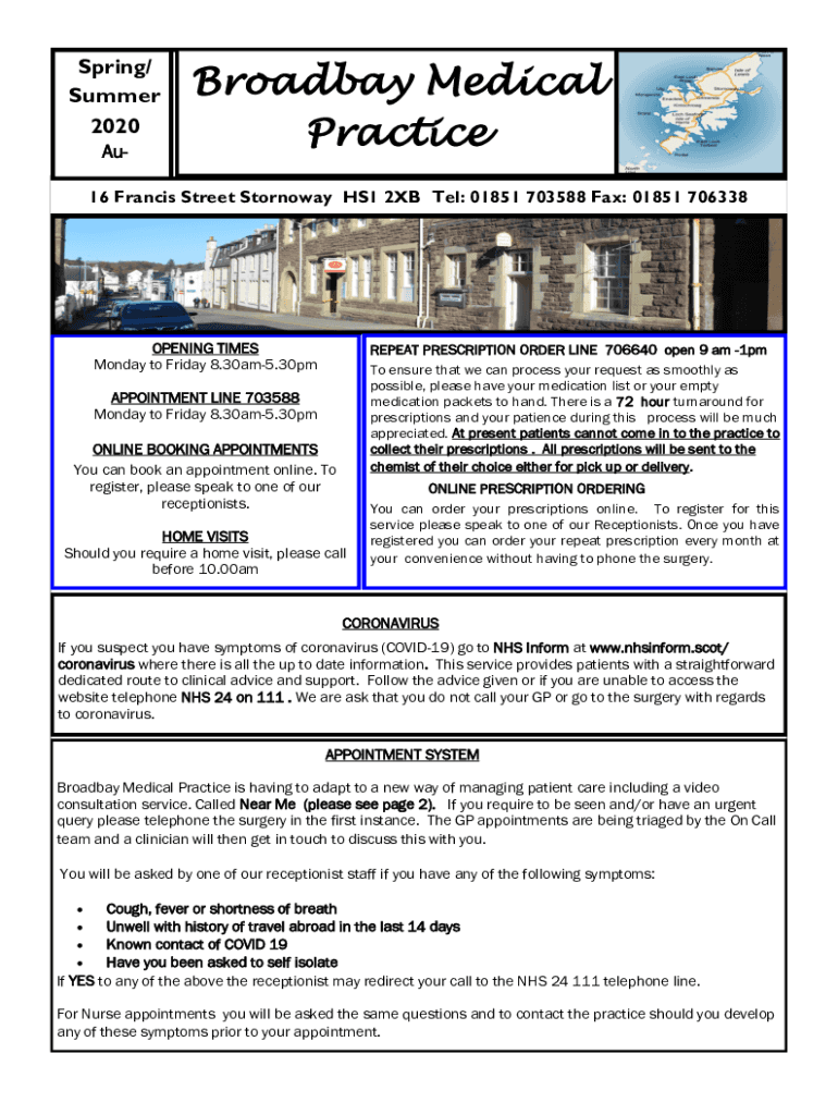 Spring/ Summer 2020 Broadway Medical Practice16 Francis Street Steinway HS1 2XB Tel: 01851 703588 Fax: 01851 706338OPENING TIMES Monday to Friday 8.30am5.30pmREPEAT PRESCRIPTION ORDER LINE 706640