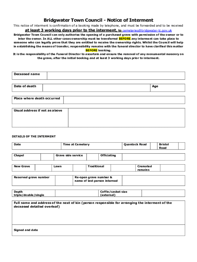 Bridgewater Town Council Notice of Interment This notice of interment is confirmation of a booking made by telephone, and must be forwarded and to be received at least 3 working days prior to the
