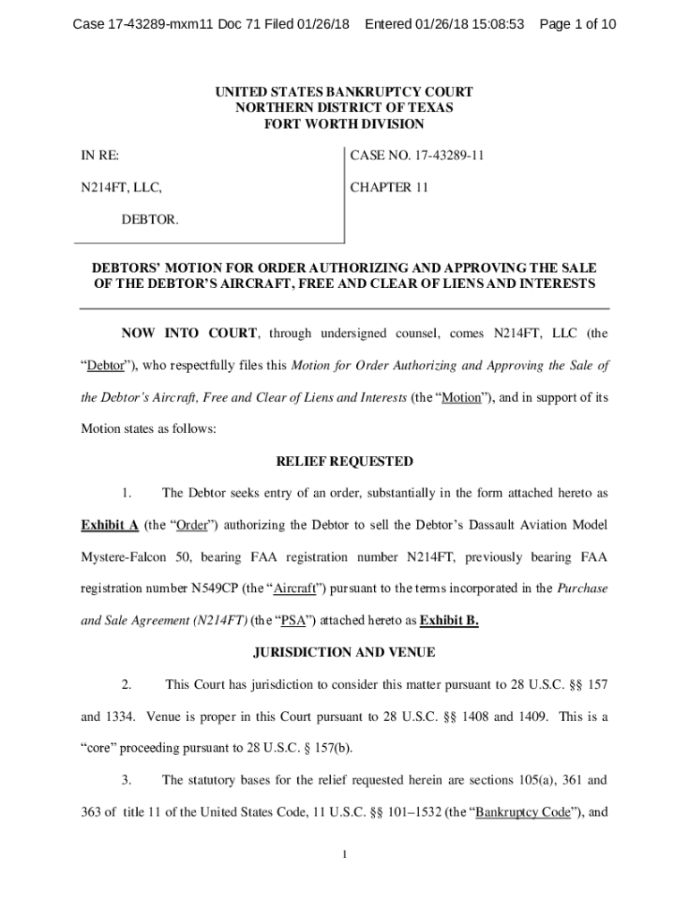 Case 1743289mxm11 Doc 71 Filed 01×26/18Entered 01×26/18 15:08:53Page 1 of 10UNITED STATES BANKRUPTCY COURT NORTHERN DISTRICT OF TEXAS FORT WORTH DIVISION IN RE:CASE NO. 174328911N214FT, LLC, CHAPTER