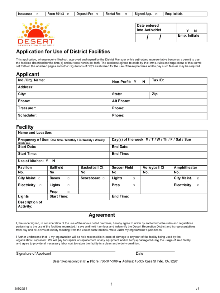 InsuranceForm 501c3 Deposit Fee Rental Designed App. EMP. InitialsDate entered into Activeness//Y N EMP. InitialsApplication for Use of District Facilities This application, when properly filled out,