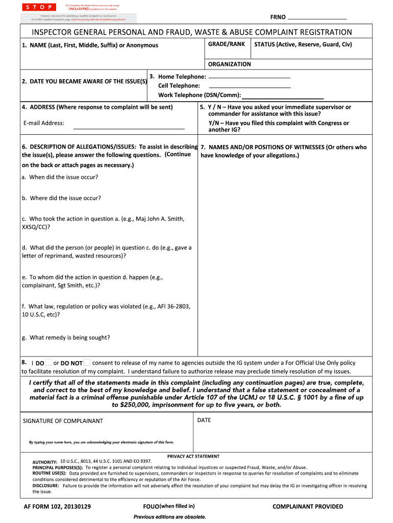 ARNO INSPECTORGENERALPERSONALANDFRAUD, WASTE&ABUSECOMPLAINTREGISTRATION GRADE/RANK 1.NAME(Last, First, Middle, Suffix)anonymous STATUS(Active, Reserve, Guard, CIV) ORGANIZATION 2.DATEYOUBECAMEAWAREOFTHEISSUE(S)