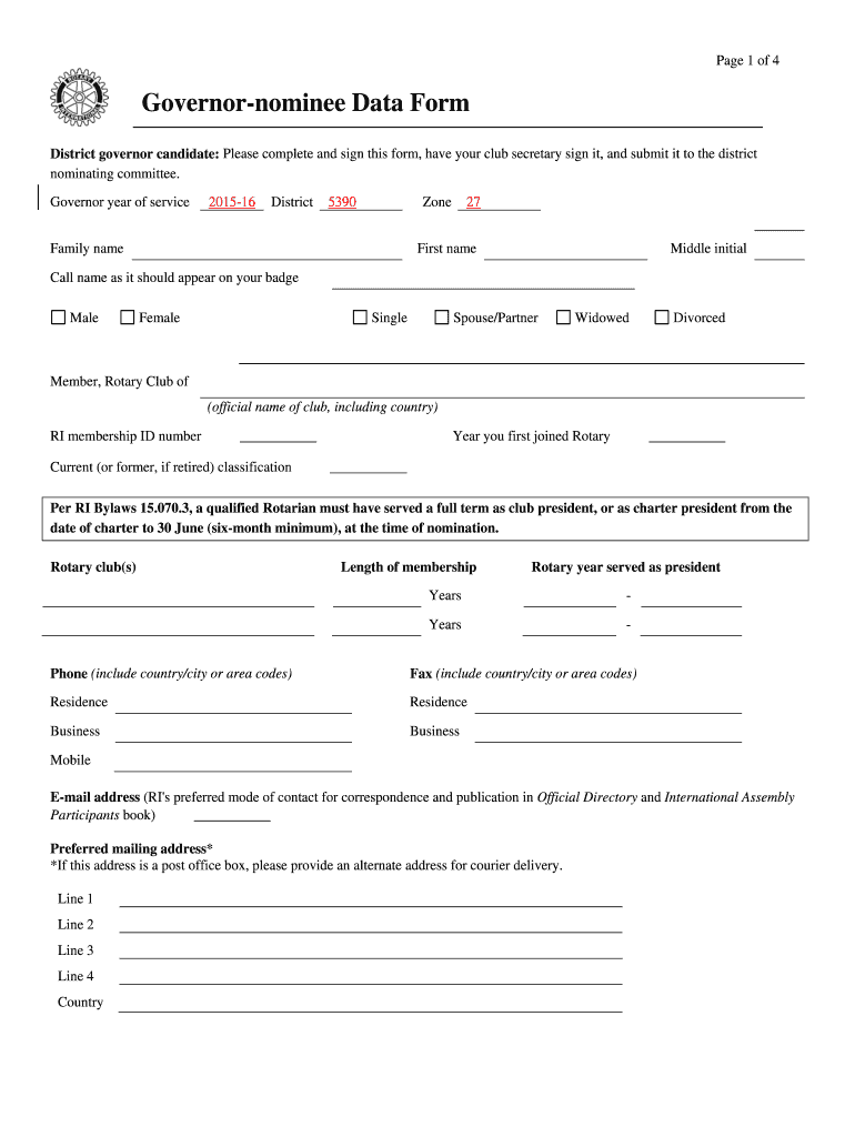 Page 1 of 4 Governor-nominee Data Form District governor candidate: Please complete and sign this form, have your club secretary sign it, and submit it to the district nominating committee. Governor