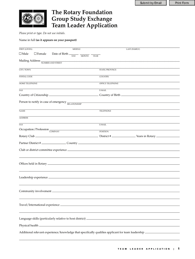 The Rotary Foundation Group Study Exchange Team Leader Application is a personal form used by Rotary International members to apply for the role of team leader in the Group Study Exchange program.