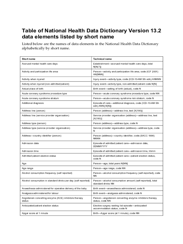 Table of National Health Data Dictionary Version 13.2 data elements listed by short name Listed below are the names of data elements in the National Health Data Dictionary alphabetically by short