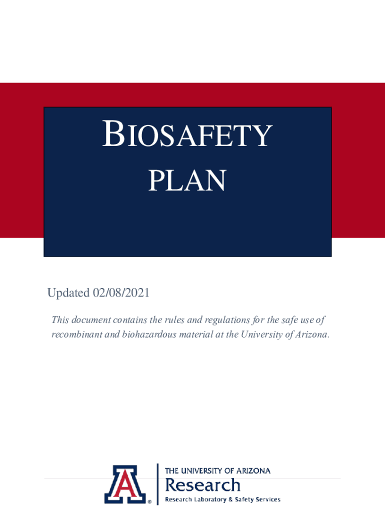 BIOSAFETY PLANUpdated 02×08/2021 This document contains the rules and regulations for the safe use of recombinant and biohazardous material at the University of Arizona. TABLE OF CONTENTS Mission