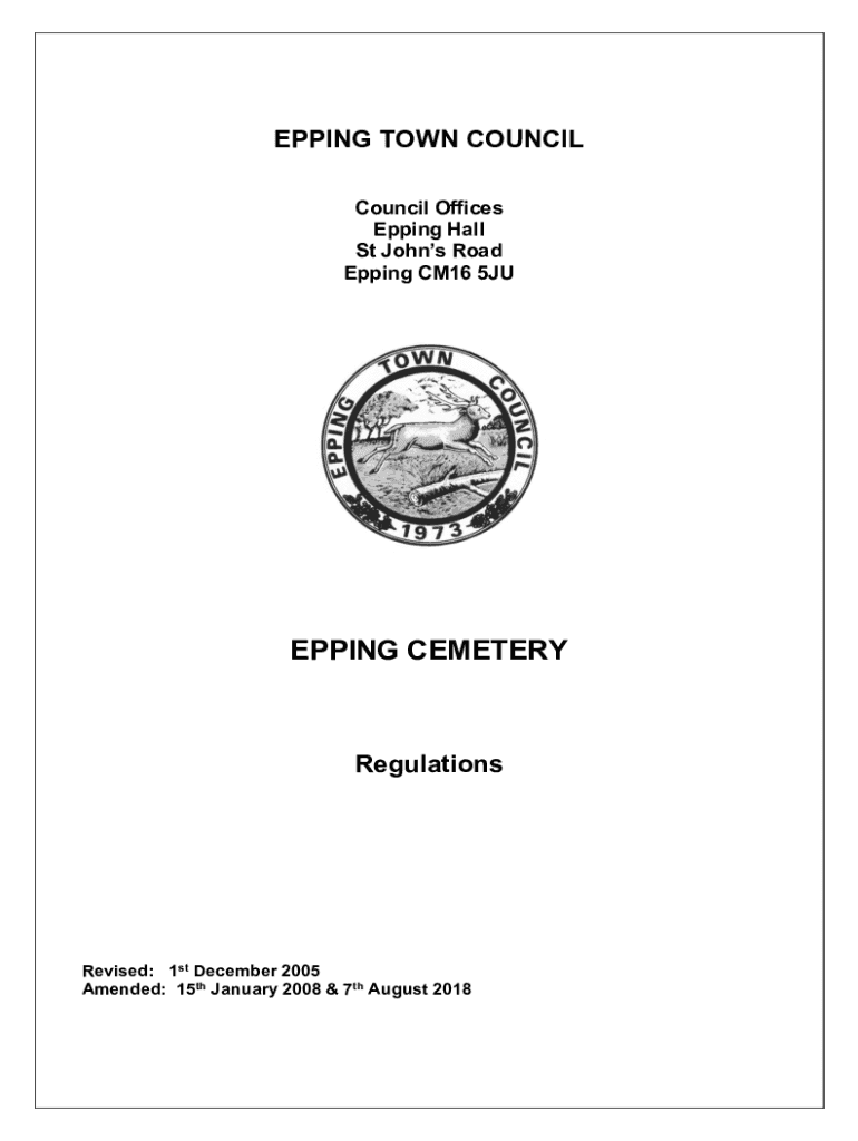 UPPING TOWN COUNCIL Offices Upping Hall St Johns Road Upping CM16 5JUEPPING CEMETERYRegulationsRevised: 1st December 2005 Amended: 15th January 2008 & 7th August 2018Epping Cemetery Bury Lane EppingCEMETERY
