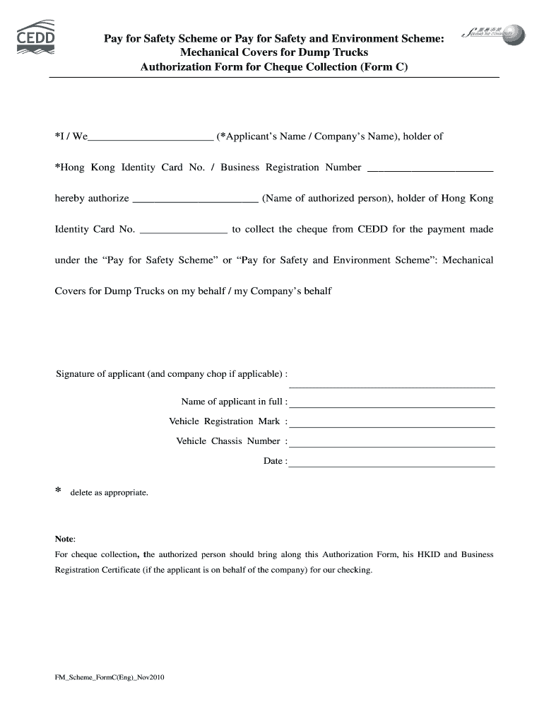 Pay for Safety Scheme or Pay for Safety and Environment Scheme: Mechanical Covers for Dump Trucks Authorization Form for Check Collection (Form C) *I / We (*Applicants Name / Companies Name), holder