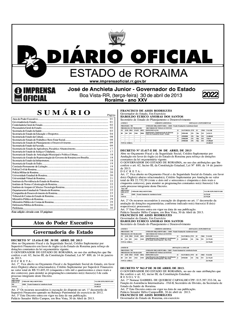 WWW.imprensaoficial.RR.gov.BR Jo's DE Ancient Junior — Governor do Est ado 2022 Boa Vista-RR, (TER Ankara) 30 de April de 2013 Roraima — ANO XXV SUM RIO P Gina Atos do Power Executive.................................................................................................................