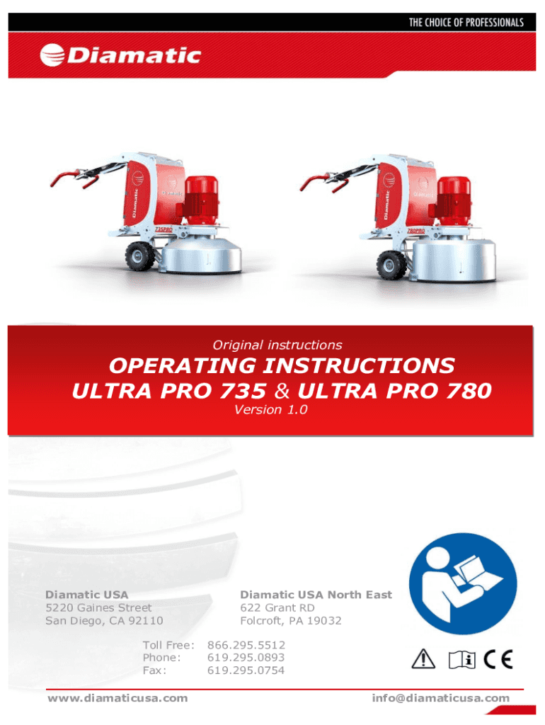 Original instructionsOPERATING INSTRUCTIONS ULTRA PRO 735 & ULTRA PRO 780 Version 1.0Diamatic USA 5220 Gaines Street San Diego, CA 92110 Toll Free: Phone: Fax: www.diamaticusa.comDiamatic USA North