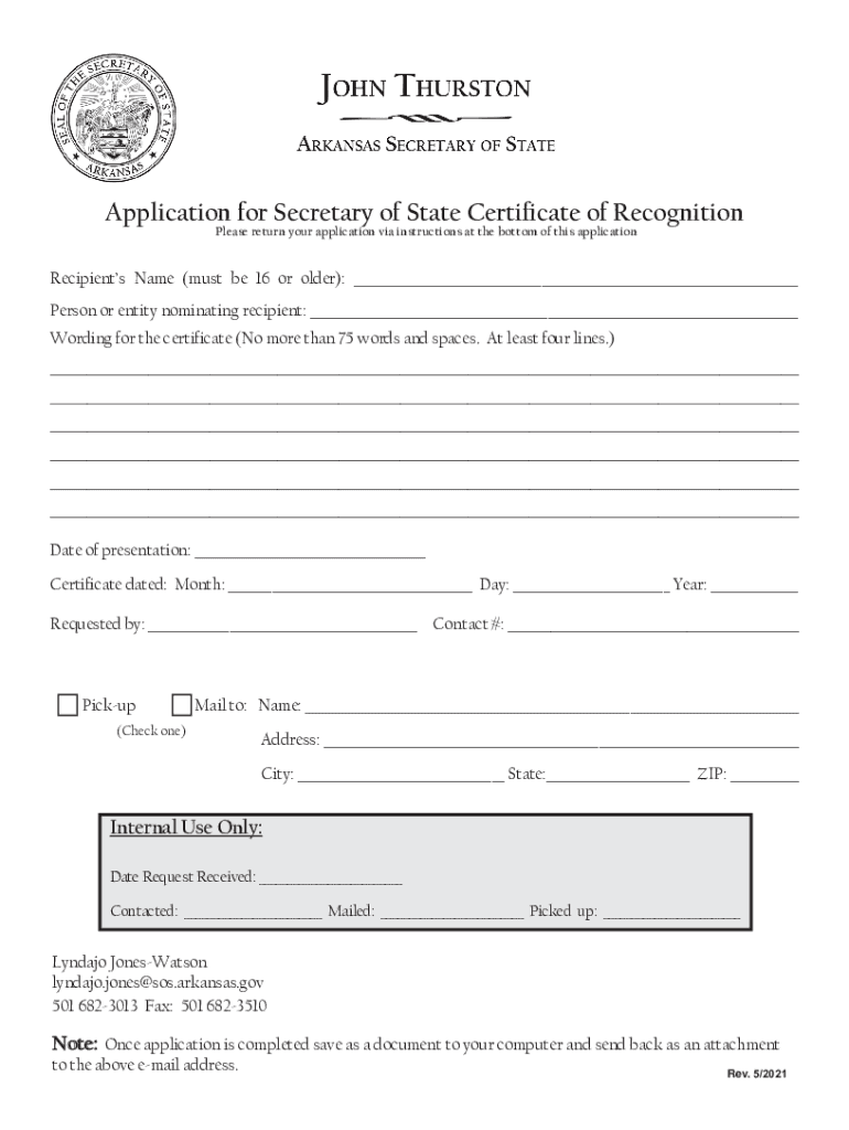 Application for Secretary of State Certificate of Recognition Please return your application via instructions at the bottom of this applicationRecipients Name (must be 16 or older): ___ Person or