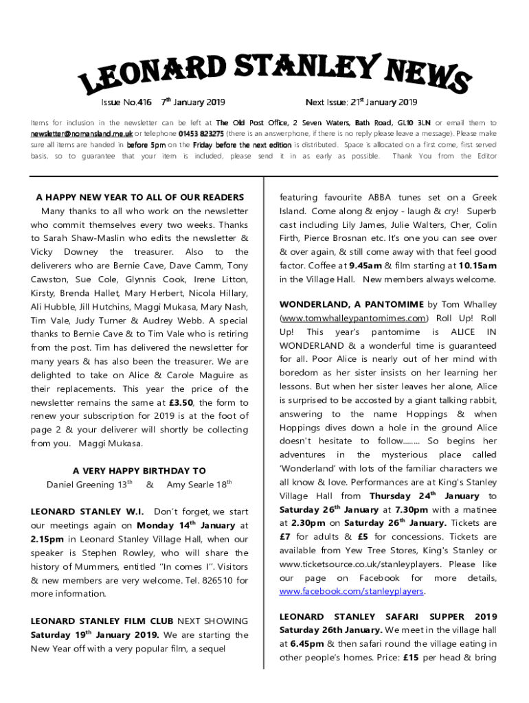 Issue No.41 No.4167th January 2019Next Issue: 21st January 2019Items for inclusion in the newsletter can be left at The Old Post Office, 2 Seven Waters, Waters, Bath Road, GL10 3LN or email them to