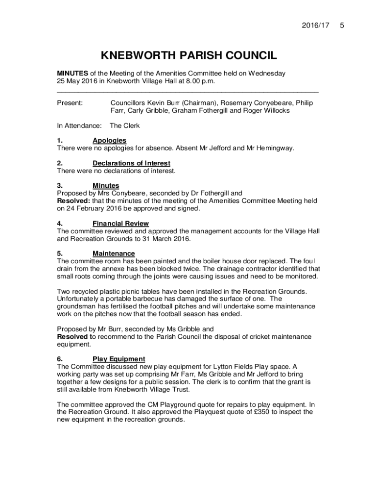 2016×17KNEBWORTH PARISH COUNCIL MINUTES of the Meeting of the Amenities Committee held on Wednesday 25 May 2016 in Bedworth Village Hall at 8.00 p.m.___ Present:Councillors Kevin Burr (Chairman×,