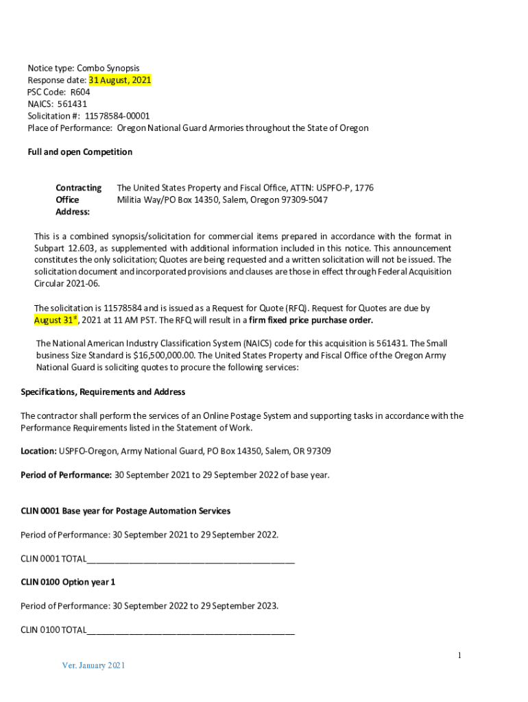 Notice type: Combo Synopsis Response date: 31 August 2021 PSC Code: R604 NAILS: 561431 Solicitation #: 1157858400001 Place of Performance: Oregon National Guard Armories throughout the State of Oregon