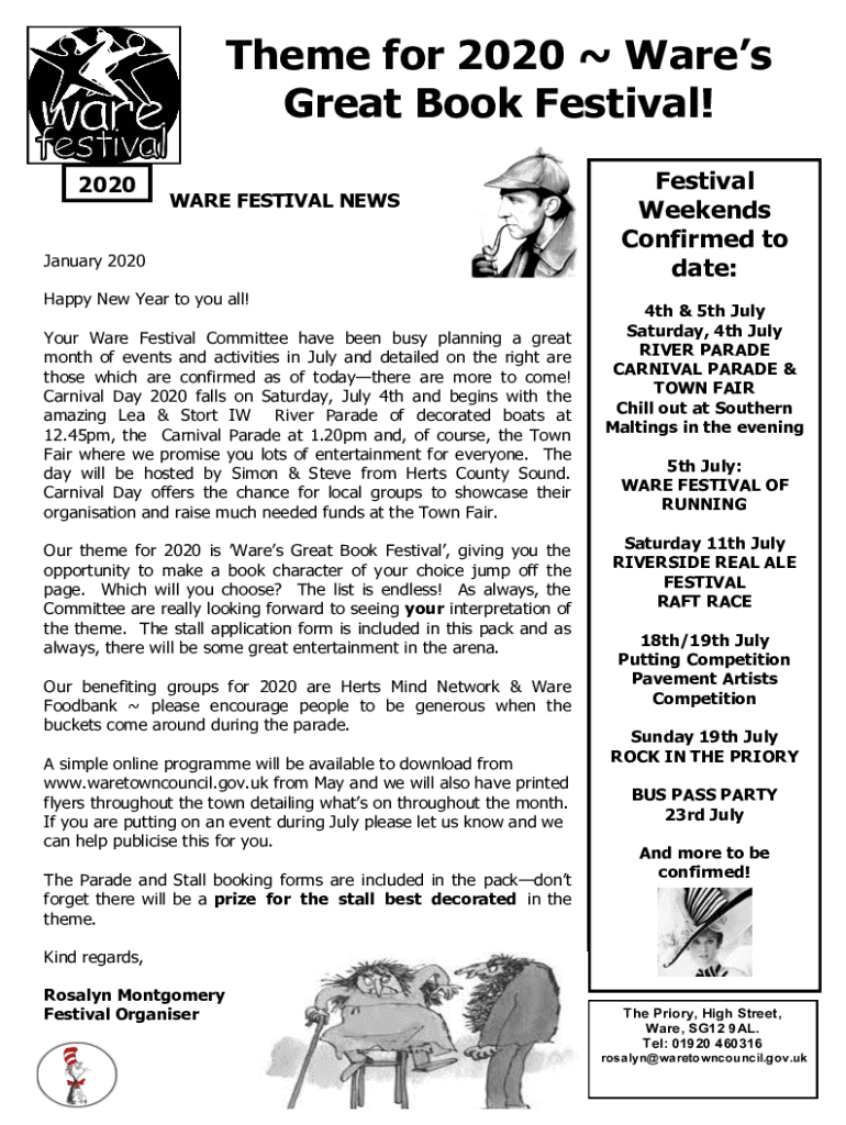Theme for 2020 Wares Great Book Festival! 2020WARE FESTIVAL NEWS January 2020 Happy New Year to you all! Your Ware Festival Committee have been busy planning a great month of events and activities