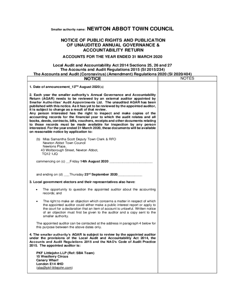 Smaller authority name:NEWTON ABBOT TOWN COUNCILNOTICE OF PUBLIC RIGHTS AND PUBLICATION OF UNAUDITED ANNUAL GOVERNANCE & ACCOUNTABILITY RETURN ACCOUNTS FOR THE YEAR ENDED 31 MARCH 2020 Local Audit