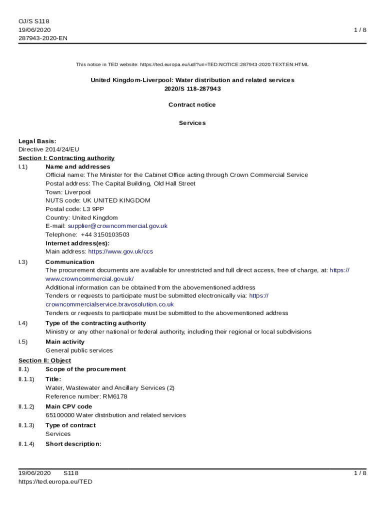 OJ×S S118 19×06/2020 2879432020EN1×8This notice in TED website: HTTPS://ted. Europa.EU×UDL?united:NOTICE:2879432020:TEXT:EN:HTMLUnited Kingdom Liverpool: Water distribution and related services