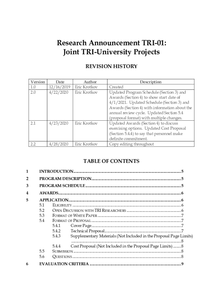Research Announcement TRI01: Joint Preuniversity Projects REVISION HISTORY Version Date 1.0 12×16/2019 2.0 4×22/2020Author Eric Proton Eric Krotkov2.14×23/2020Eric Krotkov2.24×28/2020Eric KrotkovDescription