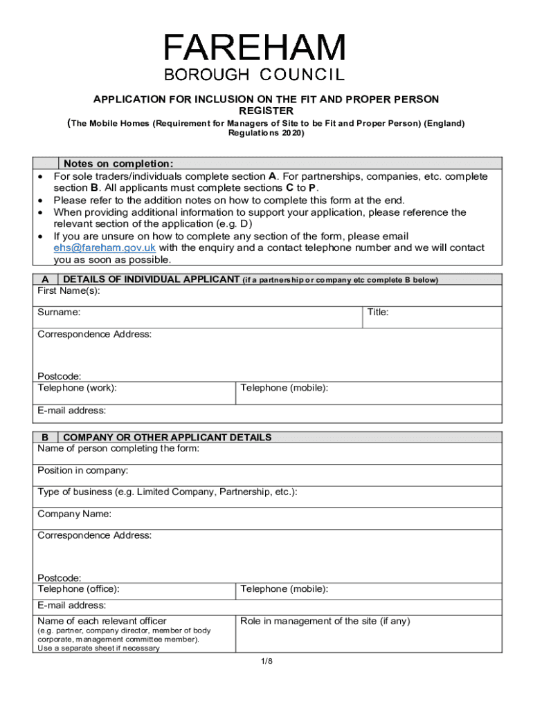 APPLICATION FOR INCLUSION ON THE FIT AND PROPER PERSON REGISTER×The Mobile Homes (Requirement for Managers of Site to be Fit and Proper Person) (England) Regulations 2020) Notes on completion: For