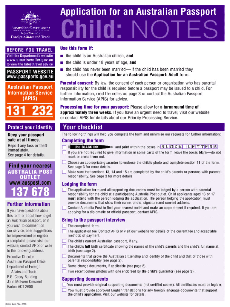 Application for an Australian Passport Child: NOTES Before you travel Use this form if: Visit the Departments' website the child is an Australian citizen, and to view the latest travel advice the
