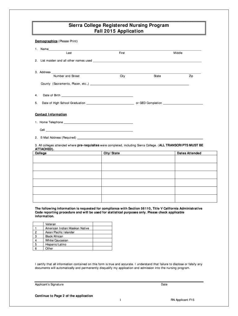 Get the free 2015 Fall RN application - Sierra College - sierracollege