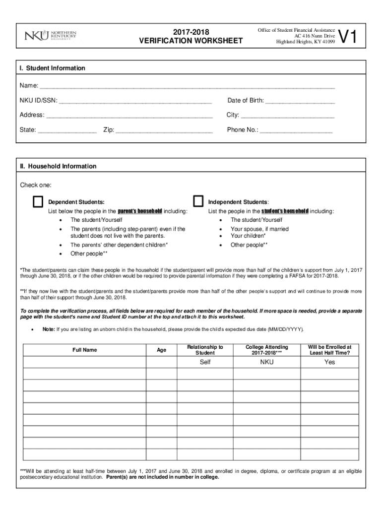 20172018 VERIFICATION WORKSHEETOffice of Student Financial Assistance AC 416 Nun Drive Highland Heights, KY 41099V1I. Student Information Name: ___ NU ID×SSN: ___Date of Birth: ___Address: ___City: