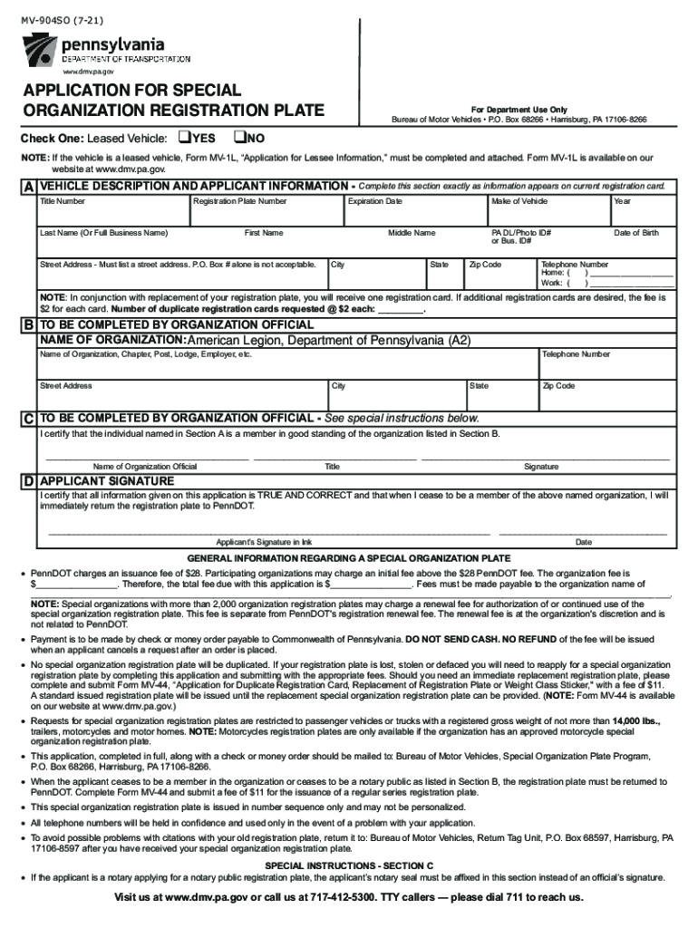 MV904SO (721×www.dmv.pa.govAPPLICATION FOR SPECIAL ORGANIZATION REGISTRATION PLATE Check One: Leased Vehicle:q Nestor Department Use Only Bureau of Motor Vehicles P.O. Box 68266 Harrisburg, PA 171068266q