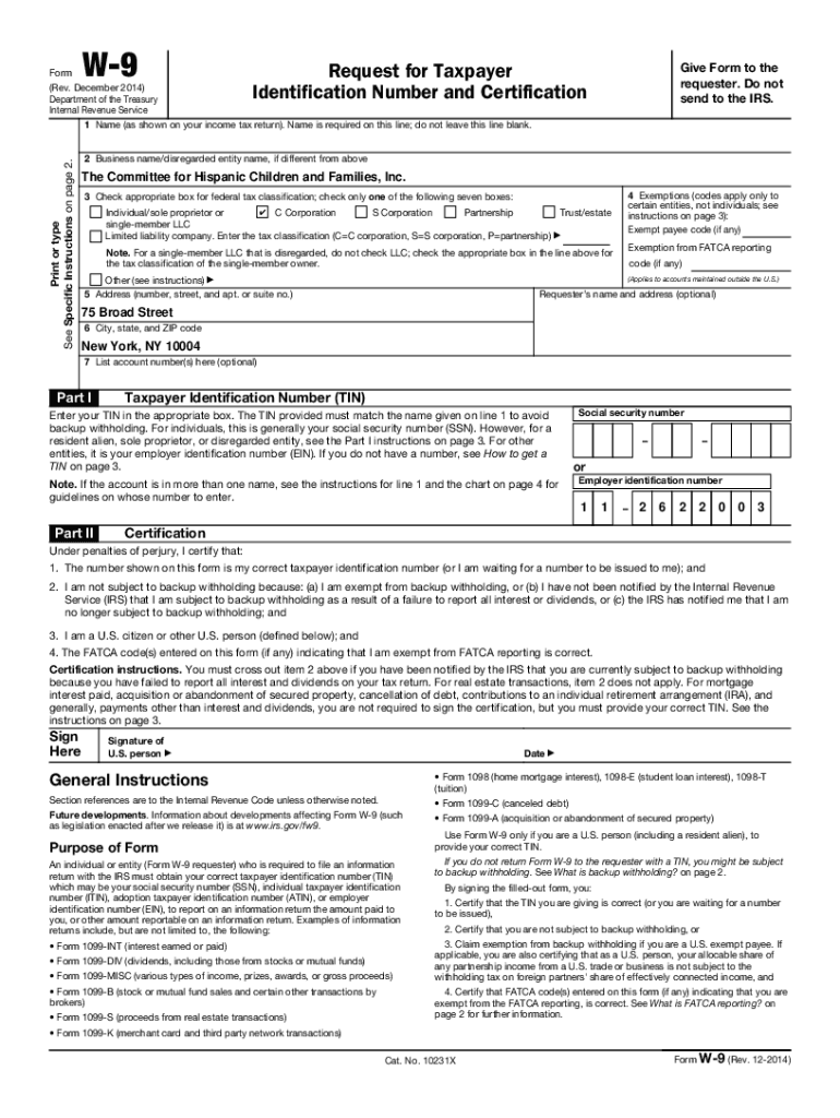 W9Form (Rev. December 2014) Department of the Treasury Internal Revenue ServiceRequest for Taxpayer Identification Number and CertificationGive Form to the requester. Do not send to the IRS. Print