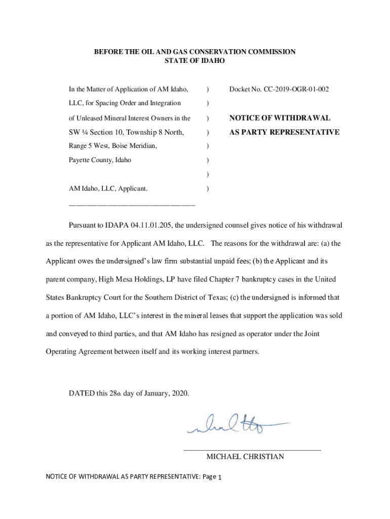 BEFORE THE OIL AND GAS CONSERVATION COMMISSION STATE OF Idahoan the Matter of Application of AM Idaho, ×Docket No. CC2019OGR01002LLC, for Spacing Order and Integration×of Unleashed Mineral Interest