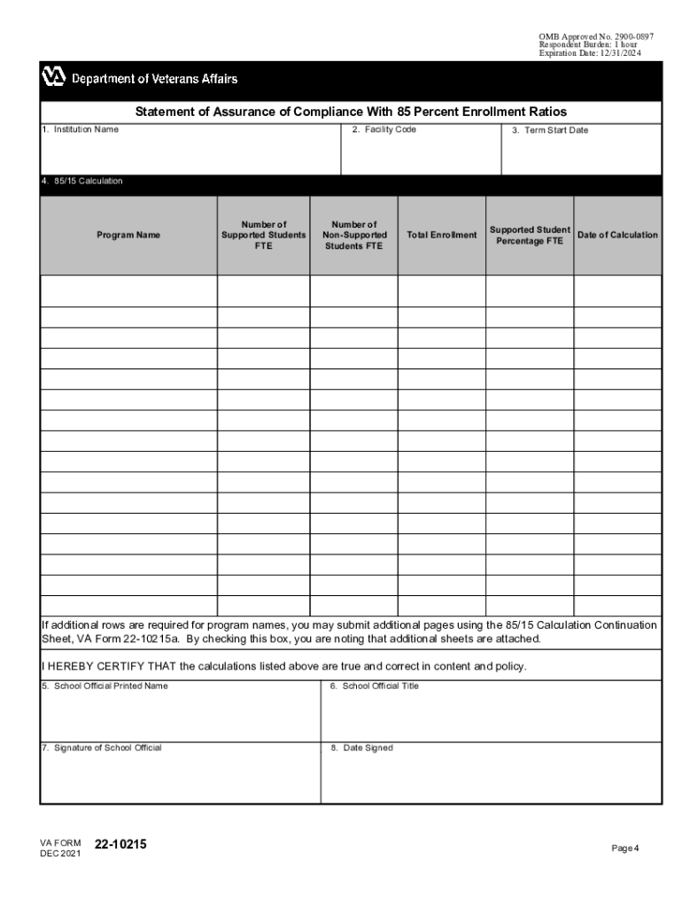STATEMENT OF ASSURANCE OF COMPLIANCE WITH 85 PERCENT ENROLLMENT RATIOS GENERAL INFORMATION Use this form (VA Form 2210215) to provide 85×15 calculations as required by Title 38 United States Code