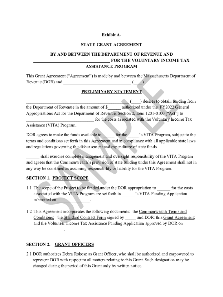 Exhibit STATE GRANT AGREEMENT BY AND BETWEEN THE DEPARTMENT OF REVENUE AND ___ FOR THE VOLUNTARY INCOME TAX ASSISTANCE PROGRAM This Grant Agreement (Agreement) is made by and between the Massachusetts