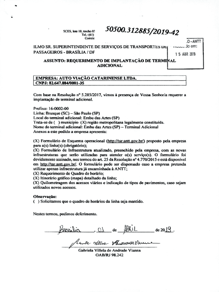 Li50500.312885×201942 Corral IMO SR. Superintendent DE SERVOS DE Transported LA PASSAGES Brasília / OF .0 ANTI Jo em:11.15 ABR 2019ASSUNTO: REQUIREMENTS DE IMPLANT AO DE TERMIj4AL ADDITIONAL EMPRESS:
