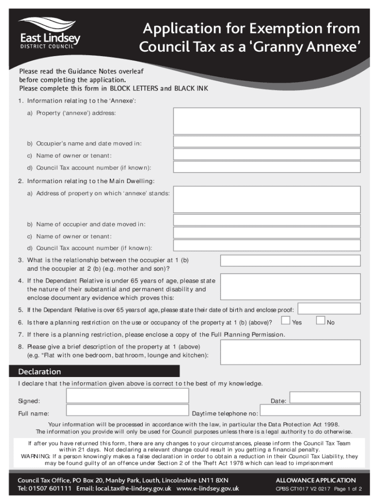 Application for Exemption from Council Tax as a Granny Annexed Please read the Guidance Notes overleaf before completing the application. Please complete this form in BLOCK LETTERS and BLACK INK 1.
