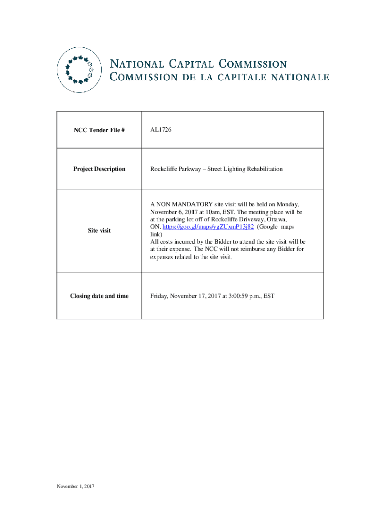 NCC Tender File #AL1726Project DescriptionRockcliffe Parkway Street Lighting Rehabilitations disclosing date and time November 1, 2017A NON-MANDATORY site visit will be held on Monday, November 6,