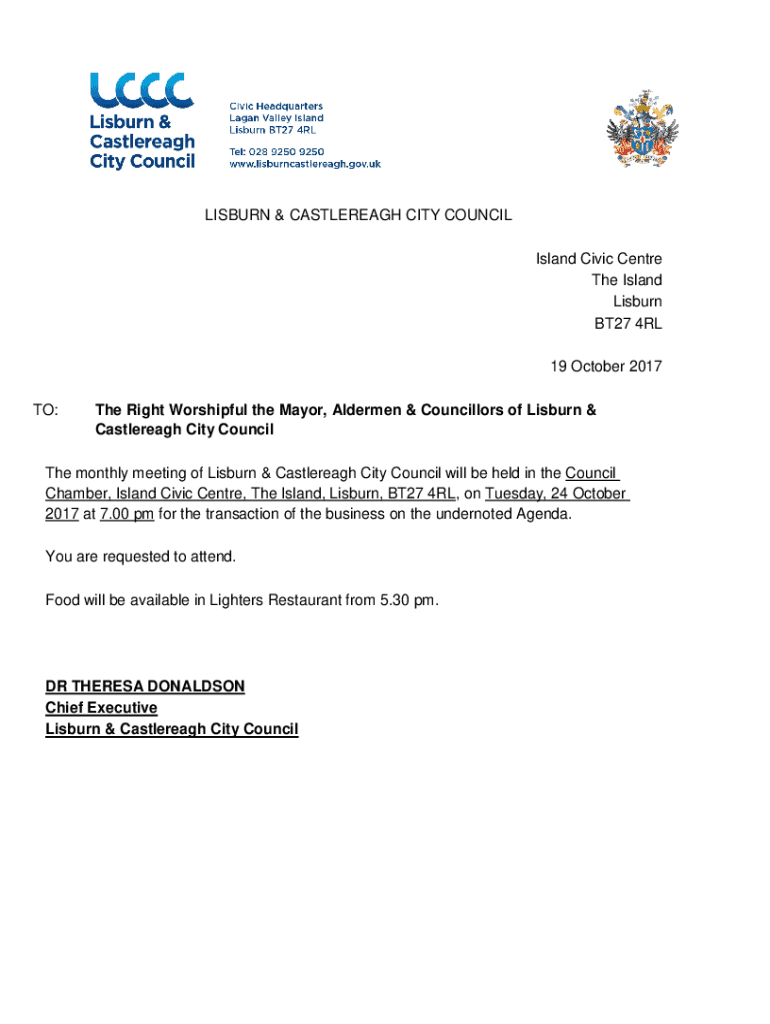 LISBON & CASTLEREAGH CITY COUNCIL Island Civic Center The Island Lisbon BT27 4RL 19 October 2017 TO:The Right Worshipful the Mayor, Aldermen & Councillors of Lisbon & Castlereagh City Council monthly