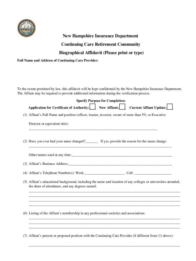New Hampshire Insurance Department Continuing Care Retirement Community Biographical Affidavit (Please print or type) Full Name and Address of Continuing Care Provider:To the extent permitted by law,