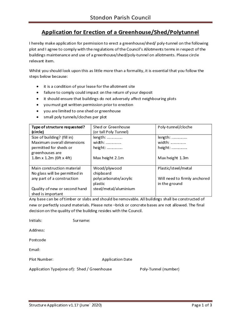 London Parish Council Application for Erection of a Greenhouse×Shed×Poly tunnel I hereby make application for permission to erect a greenhouse×shed/ poly tunnel on the following plot and I agree