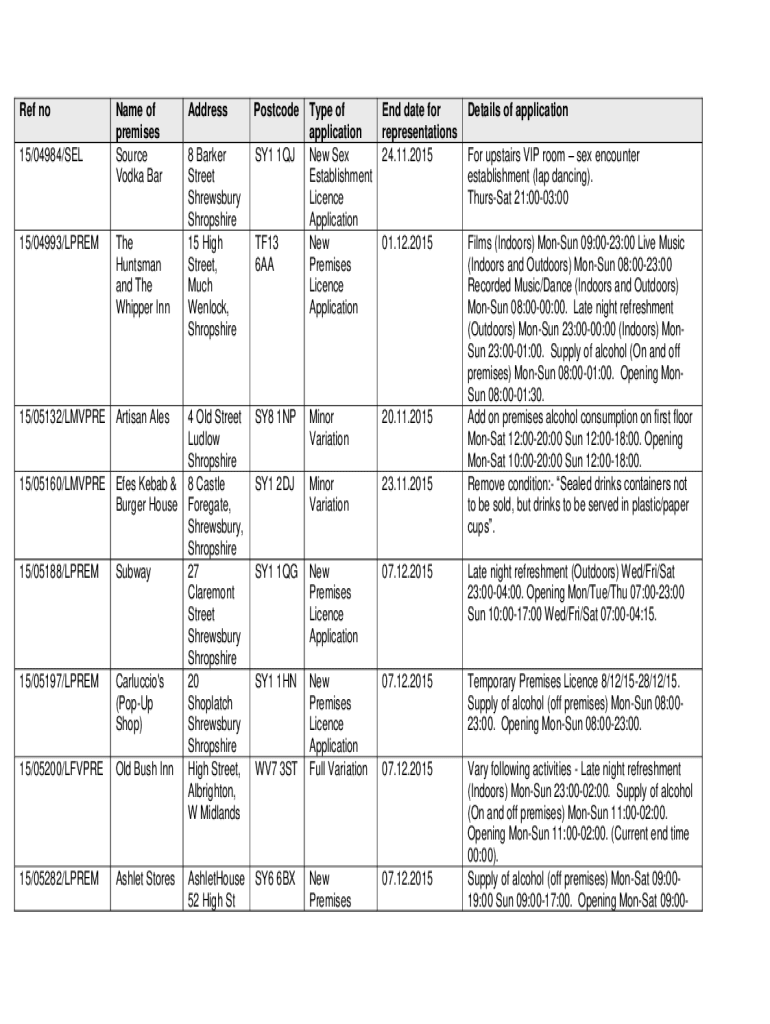Ref no 15×04984/SEL15×04993/Rename of premises Source Vodka Bathe Huntsman and The Whipper Inn15×05132/LMV PRE Artisan Ales15×05160/LMV PRE Eyes Kebab & Burger House15×05188/LPREMSubway15×05197/LPREMCarluccio\'s