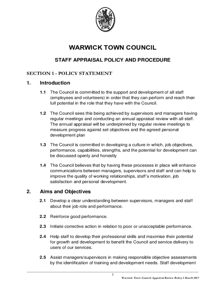 WARWICK TOWN COUNCIL STAFF APPRAISAL POLICY AND PROCEDURE SECTION 1 POLICY STATEMENT 1. Introduction 1.1 The Council is committed to the support and development of all staff (employees and volunteers)