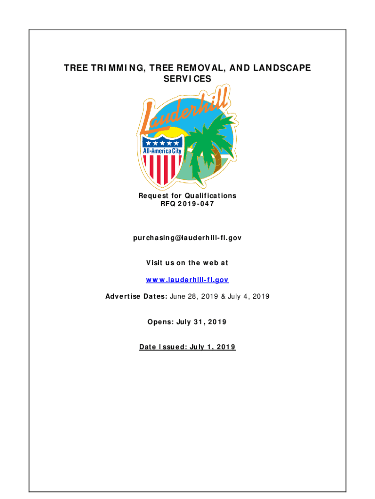 TREE TRIMMING, TREE REMOVAL, AND LANDSCAPE SERVICESRequest for Qualifications RFQ 2019047purchasing×Lauderhill.gov Visit us on the web at www.lauderhillfl.gov Advertise Dates: June 28, 2019 & July