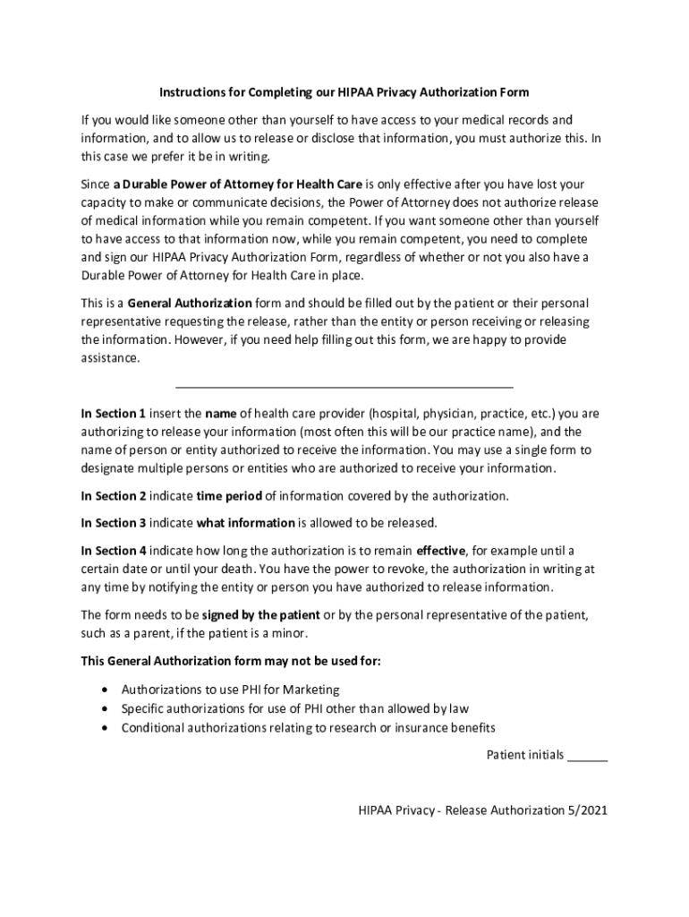 Instructions for Completing our HIPAA Privacy Authorization Form If you would like someone other than yourself to have access to your medical records and information, and to allow us to release or