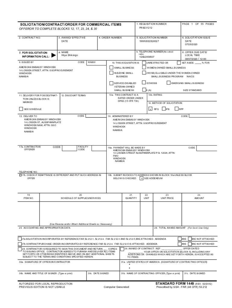 SOLICITATION×CONTRACT×ORDER FOR COMMERCIAL ITEMS OFFER OR TO COMPLETE BLOCKS 12, 17, 23, 24, & 30 2. CONTRACT NO.3. AWARD/ EFFECTIVE DATE7. FOR SOLICITATION INFORMATION CALL:a. NAME Hilda Shikongo9.