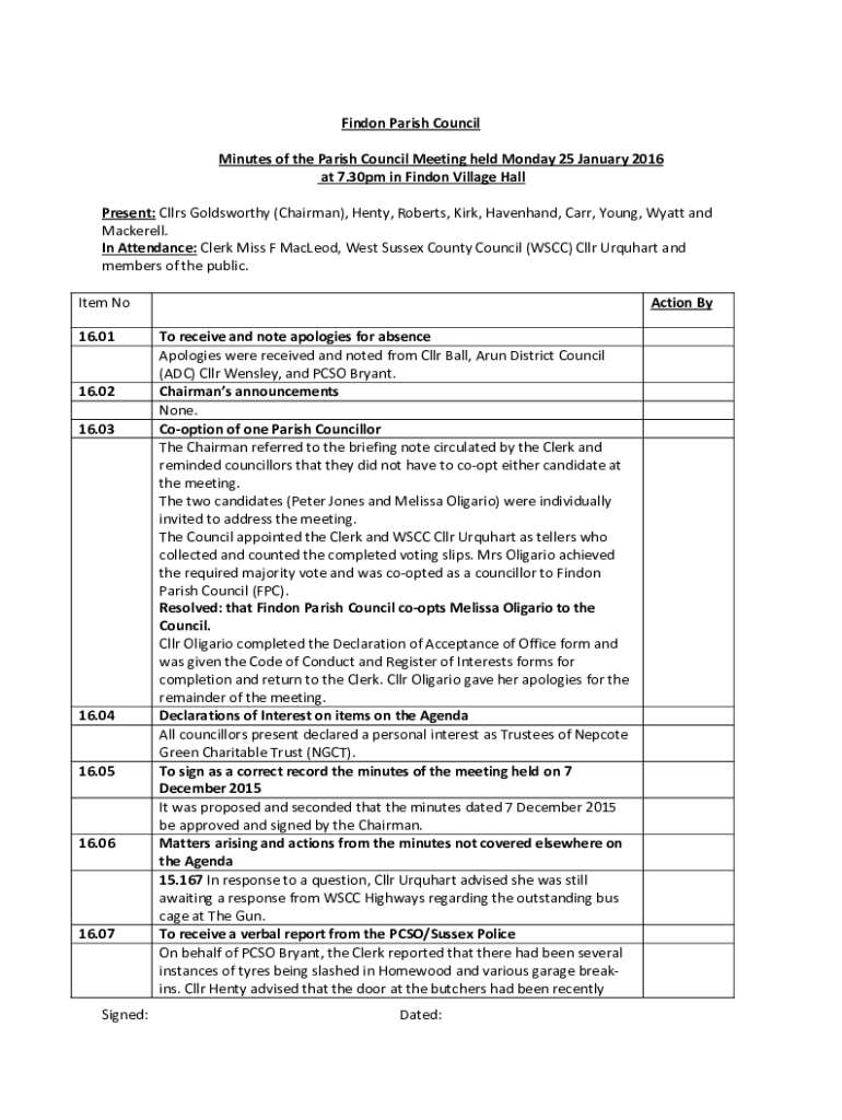 Fin don Parish Council Minutes of the Parish Council Meeting held Monday 25 January 2016 at 7.30pm in Fin don Village Hall Present: Class Goldsworthy (Chairman×, Henry, Roberts, Kirk, Haven hand,